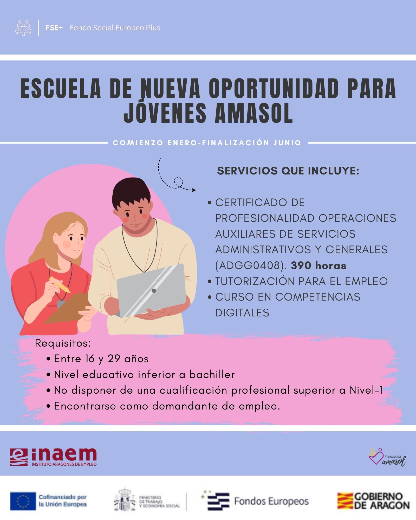 El objetivo general de la Escuela de Nueva Oportunidad de Fundación AMASOL es facilitar el acceso a la formación y el empleo de jóvenes que cohabitan en hogares monoparentales en situación de vulnerabilidad, promoviendo la igualdad de oportunidades y la inclusión social mediante una formación profesional adaptada a las demandas del mercado laboral, con el fin de mejorar su bienestar y el de sus familias.